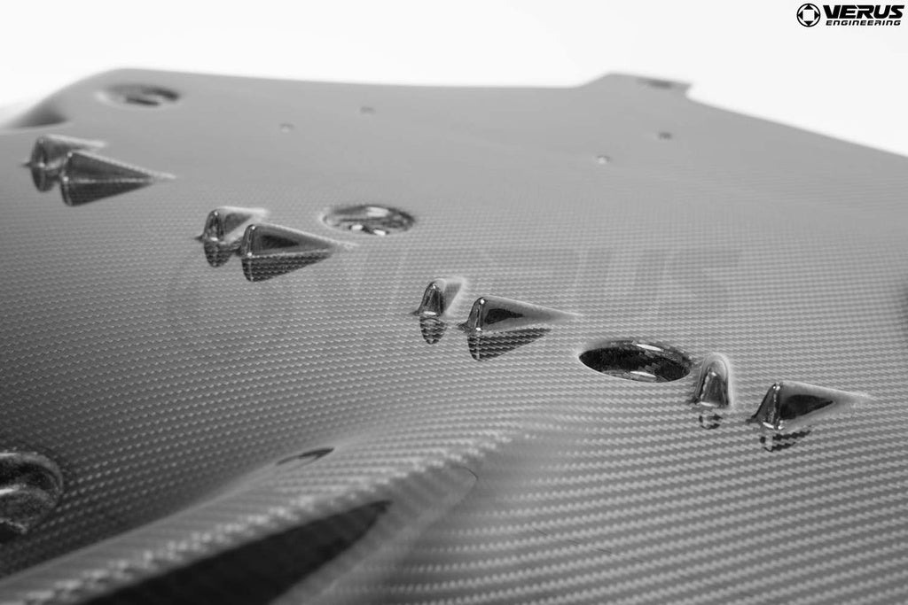 The diffuser body is produced from 2x2 twill, autoclave-cured, carbon fiber, which is then finished in an automotive clear coat for enhanced appearance and durability.
